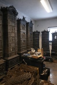 Każdy piec żeliwny, który trafia do naszej sprzedaży, jest po rozłożeniu poddawany gruntownemu przeglądowi. Po dokładnym oczyszczeniu pokrywamy go specjalną farbą żaroodporną, a następnie polerujemy dedykowaną, nietoksyczną pastą grafitową, która nadaje powierzchni głęboki, naturalny blask i podkreśla detale odlewu. Wnętrze kominka, w strefie paleniska, wyłożone jest szamotem, którego zadaniem jest skutecznie chronić żeliwo przed bezpośrednim działaniem żaru i wysokiej temperatury.